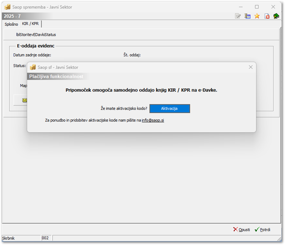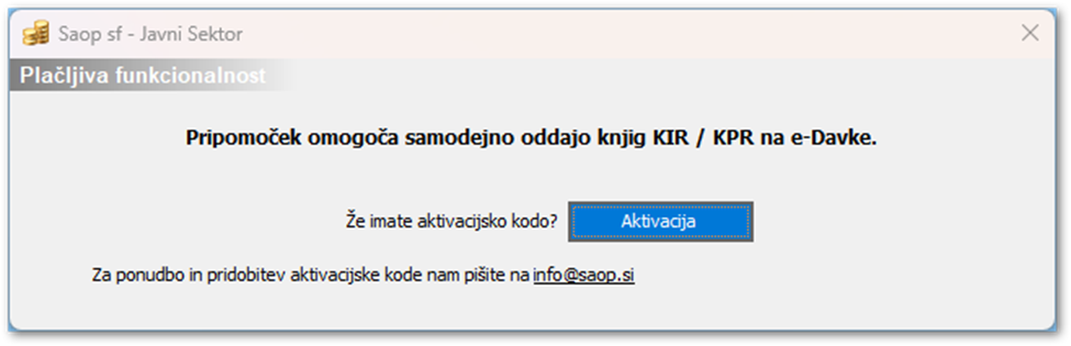 Pošiljanje evidenc s pripomočkom je možno po vpisu aktivacijske kode, katero prejmete s strani Saop tehnične podpore.