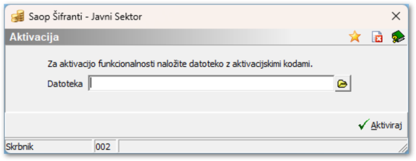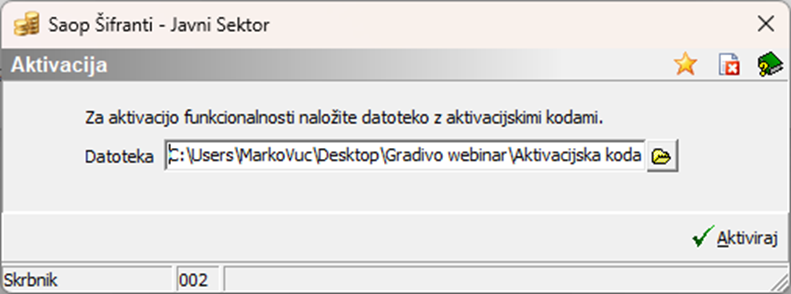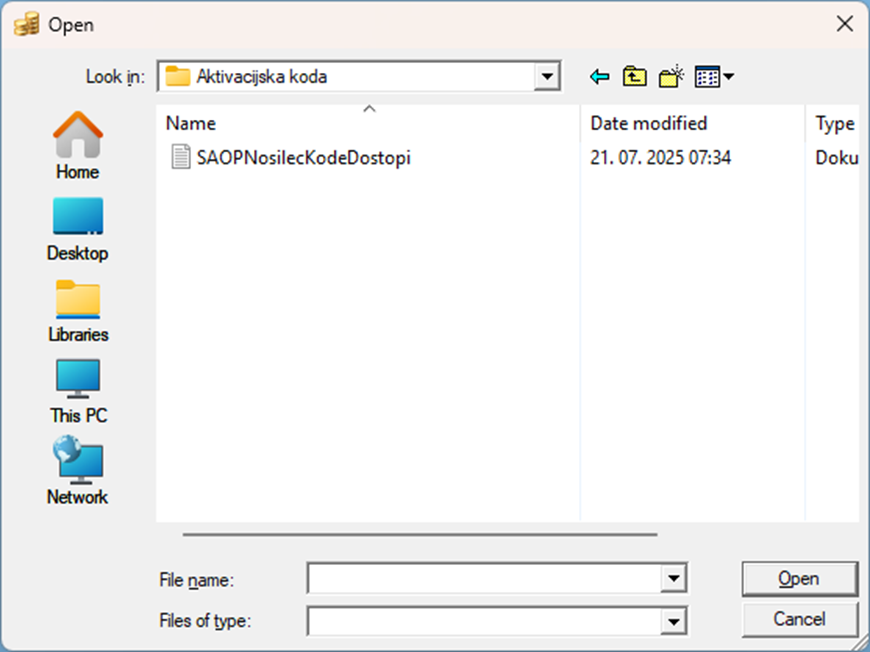 Ob pritisku gumba Aktivacija se odpre okno, kjer izberemo pot, kamor smo si predhodno shranili aktivacijsko kodo, katero nam je posredovala Saop tehnična podpora.