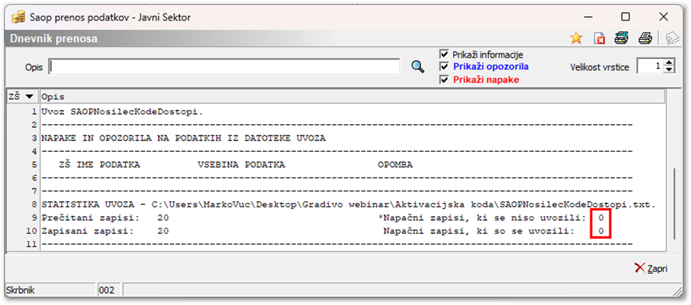 Izbrano datoteko aktivacijske kode potrdimo z gumbom Aktiviraj. Izpiše se Dnevnik prenosa, kjer preverimo, da je pri zapisu Napačni zapisi, ki se niso uvozili in Napačni zapisi, ki so se uvozili podatek 0.