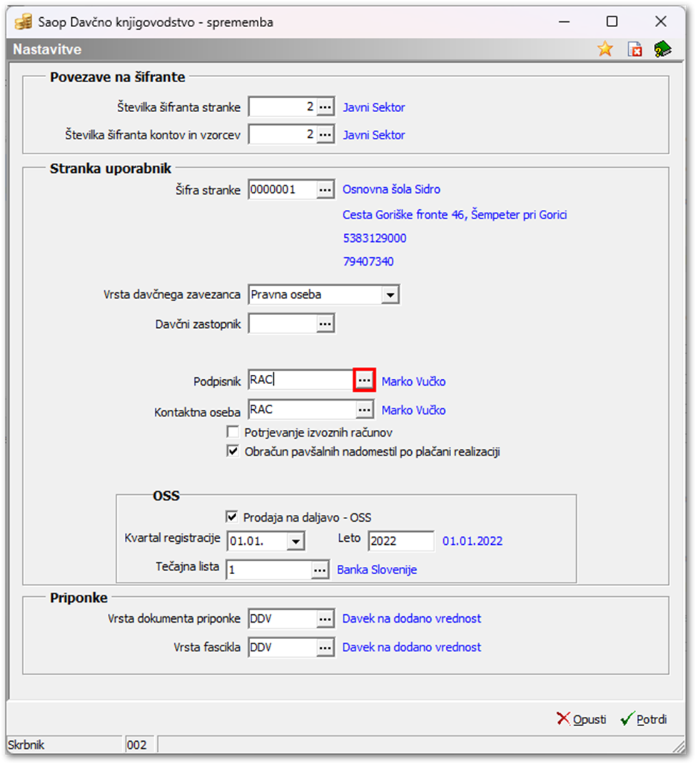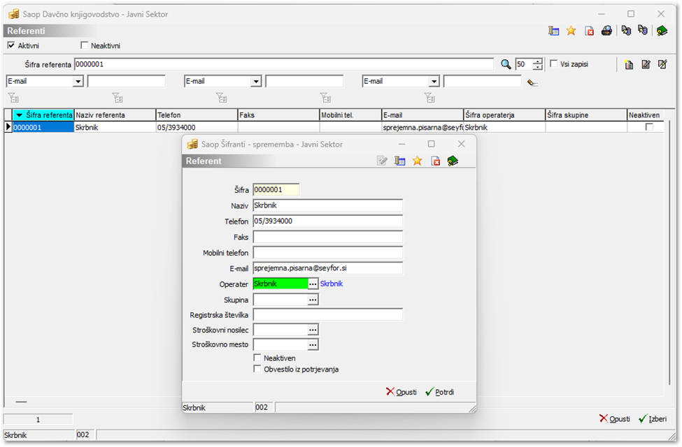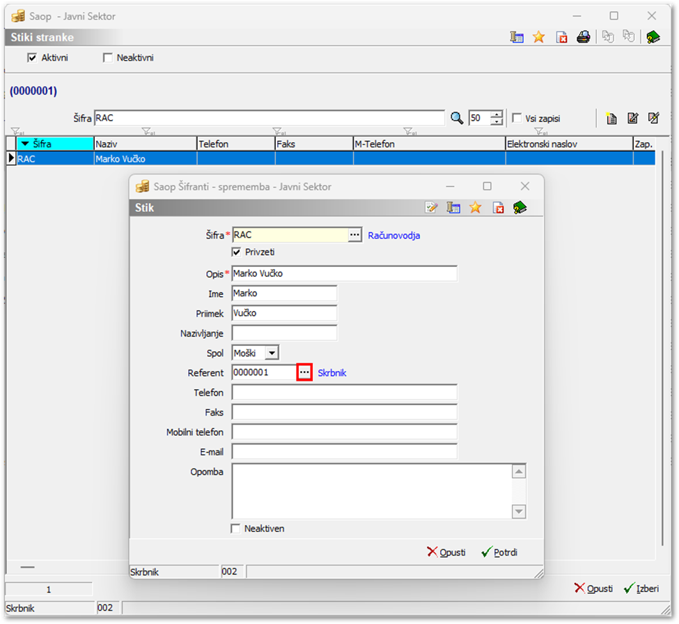 Podpisnika uredimo na gumbu za urejanje. Odprejo se Stiki stranke uporabnika. Na izbranem stiku preverimo nastavitve Referenta: