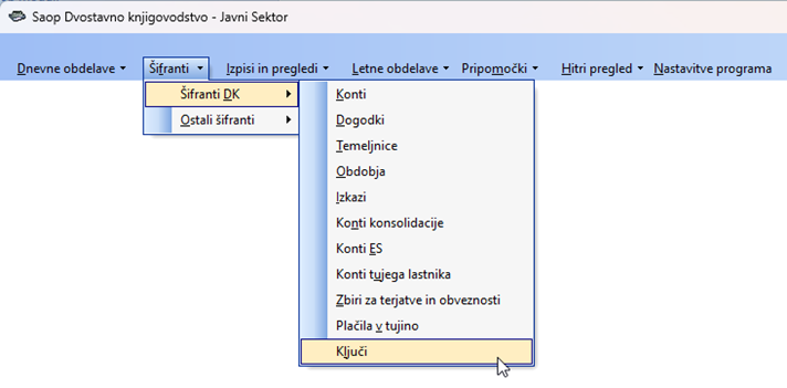 Ključe nastavimo na  Dvostavno knjigovodstvo / Šifranti / Šifranti DK / Ključi:
