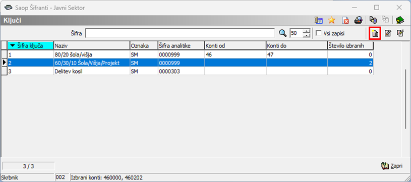 Ob potrditvi se ključ shrani v preglednici. V preglednici lahko za vsako šifro ključa vidimo podatek Naziva, Oznake analitike, Šifra analitike, Konti od do in Število izbranih kontov. Razpon kontov je prikazan, če je v ključu tudi določen: