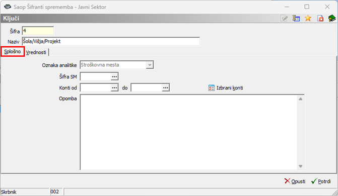 • Opomba - Po potrebi lahko vnesemo poljubno opombo, ki se nanaša na ta ključ. Lahko so to tudi navodila, ki so potrebna za knjiženje ali kaj podobnega.