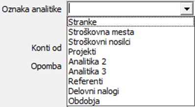 • Oznaka analitike - Izberemo tisto analitiko, ki jo želimo razdeliti po ključu. Izbiramo lahko med: