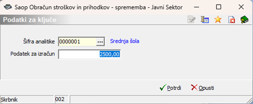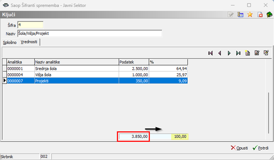 • Šifra pod Oznako analitike se aktivira šifra, ki se predlaga glede na izbrano oznako. Izberemo šifro analitike, ki jo želimo deliti po ključu.
