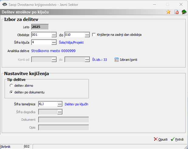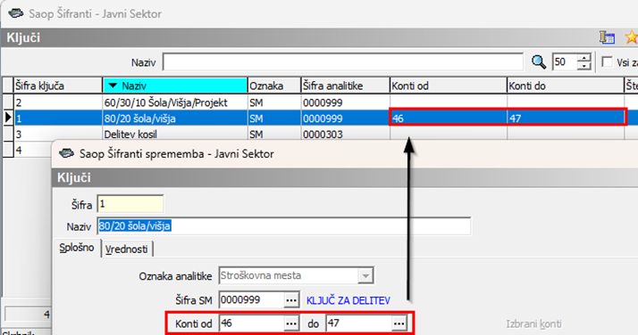 • Konti od do – program iz ključa predlaga izbrane konte. Konte lahko v trenutku delitve spremenimo.