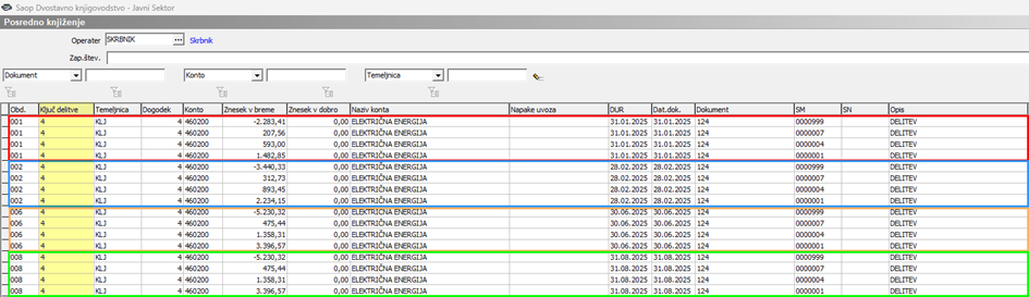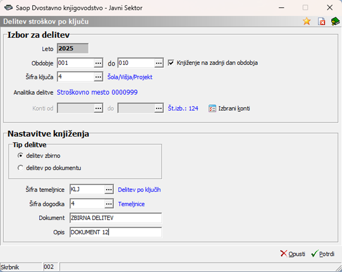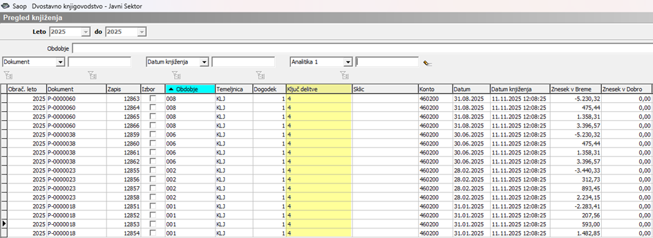 Program je v izbranih obdobjih za vsak dokument, ki je v glavni knjigi knjižen na analitiko delitve (stroškovno mesto 0000999), pripravil storno knjižbo na izbranih kontih. Za vsak dokument je hkrati pripravil vknjižbe delitev po izbranem ključu 4. Ključ delitve je zapisan na knjižbah in je kasneje viden na Pregledi kartice ali Pregledu knjiženja.
