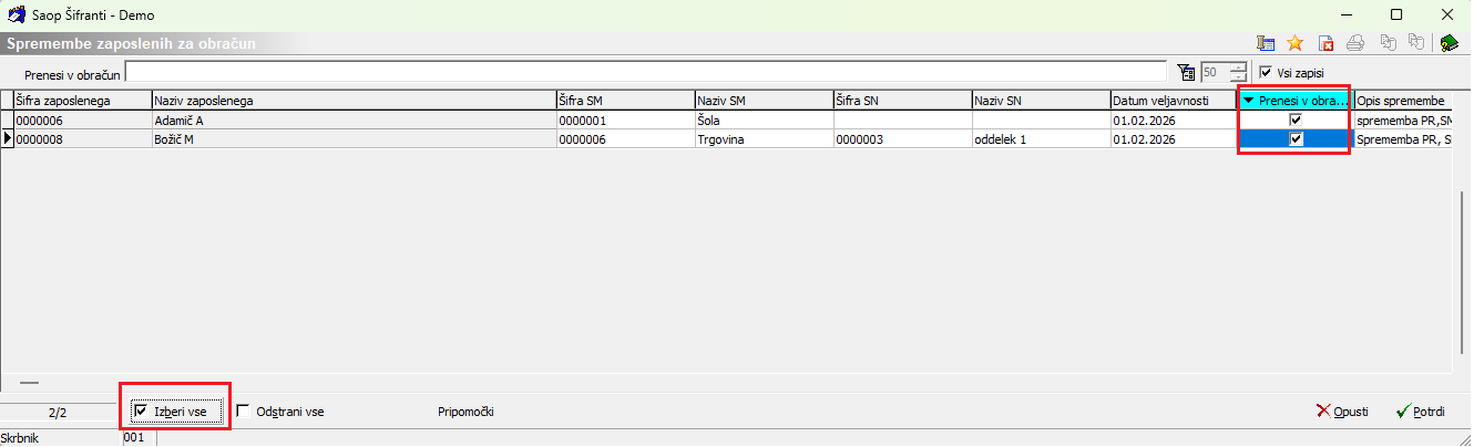 Z verzijo programa Saop 2026.01.001 oz. novejšo je bil v preglednici Sprememb zaposlenih za obračun v Posrednem oz. Neposrednem obračunu plač odstranjen stolpec Status spremembe. Nadomestili smo ga z novim stolpcem Prenesi v obračun s katerim se določi, ali se posamezen zapis spremembe za zaposlenega prenese v obračun.
