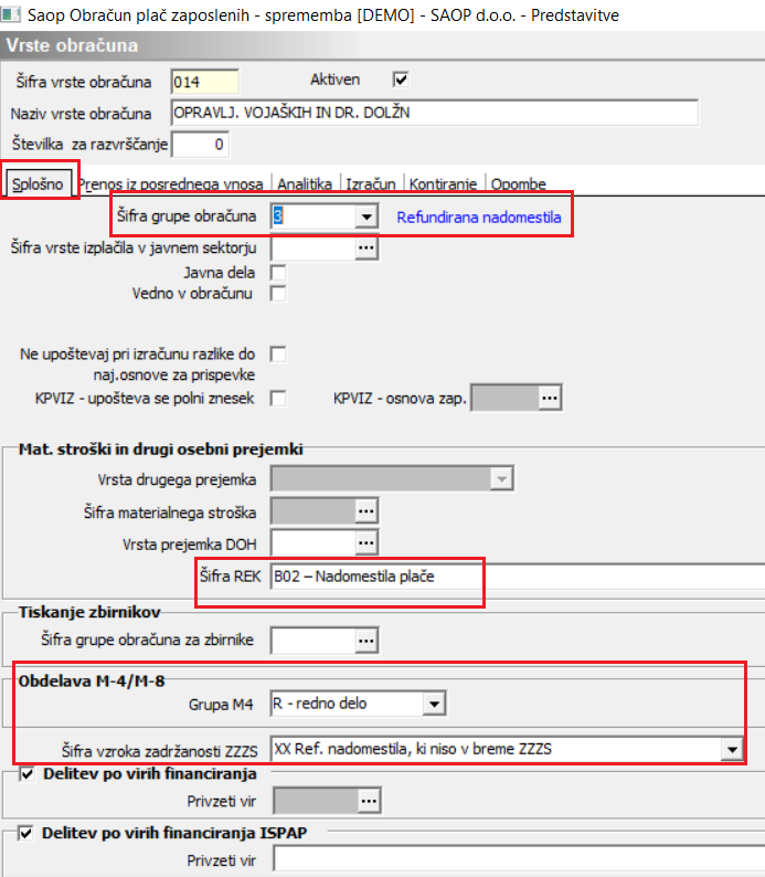 (Vrsta obračuna 014 je informativna, namenjena zgolj prikazu nastavitev na prvem zavihku Splošno)