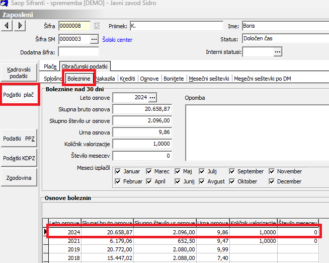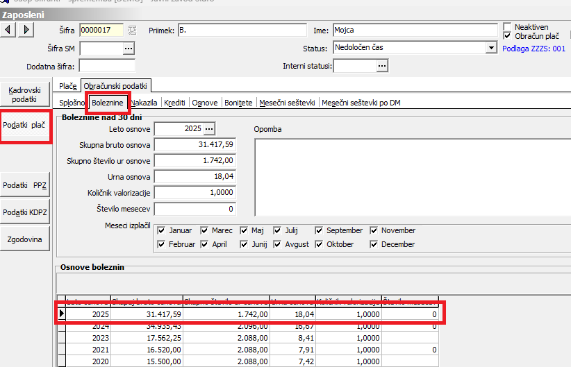 Sistem bo za takega zaposlenega preračunal osnovo za boleznino iz leta 2025 in mu jo na zaposlenega na zavihek Boleznine tudi shranil. V primeru, ko bo za takega zaposlenega uvožen v sistem e-Bol, bo sistem glede na podatek prvi dan zadržanosti sam predlagal ustrezno leto osnove (minus eno leto).