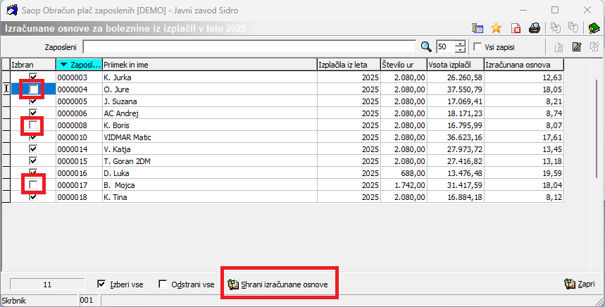 Če imamo katerega zaposlenega, za katerega velja osnova za boleznino še iz prejšnjega leta (se mu refundacija nadaljuje), se postavimo na njega ter ustrezno Odstranimo kljukico iz polja Izbran.
