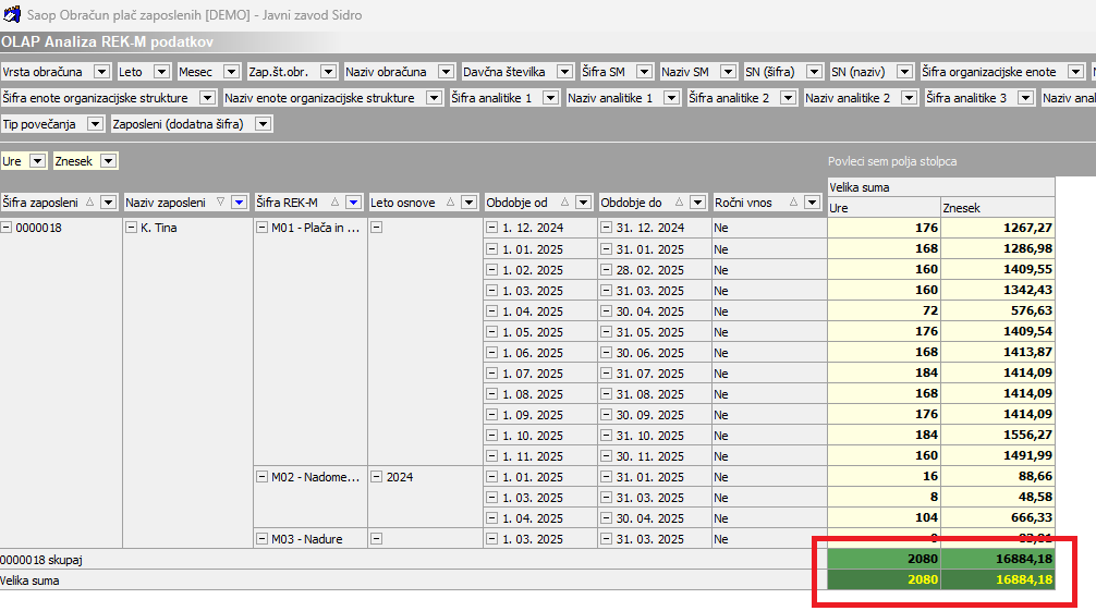 Po izključitvi se nam prikaže analiza REK-M podatkov, ki je skladna z izračunano Osnovo za boleznino. V analizi lahko vidimo tudi, če se je kateri mesec poročalo več ur kot je mesečni fond. Razliko v poročanih urah lahko nato dodatno preverimo v analizi obračunanih vrstic.