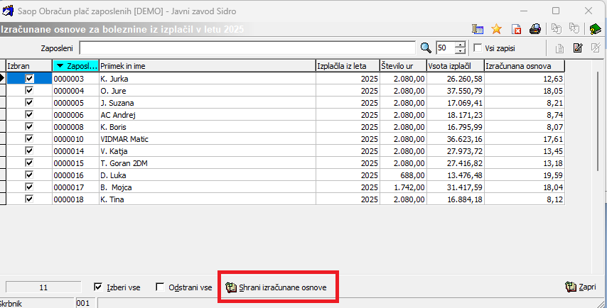 Ko so podatki ustrezno pripravljeni Kliknemo na gumb, ki se nahaja na dnu preglednice Shrani izračunane osnove.
