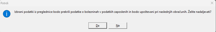 Če izbiro potrdimo, se nam podatki iz preglednice prenesejo v podatke zaposlenih na razdelek Boleznine nad 30 dni.