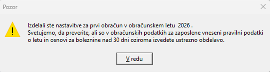 Že pri vnosu prvega obračuna za novo obračunsko leto nam program javi: