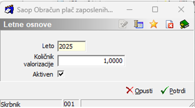 Dodamo nov zapis – v podatek Leto vpišemo 2025, v podatek Količnik valorizacije pa številko 1. Potrdimo.
