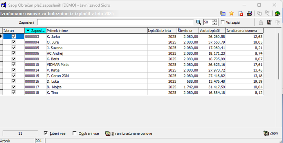 Sistem nam pri vseh zaposlenih ponudi Kljukico pri podatku Izbran. Tudi če imamo katerega zaposlenega, za katerega velja osnova za boleznino še iz prejšnjega leta (se mu refundacija nadaljuje), mu NI potrebno odstraniti kljukice v polju Izbran, kot se je to izvajalo pretekla leta. Vsem zaposlenim pustimo kljukico v polju Izbran!