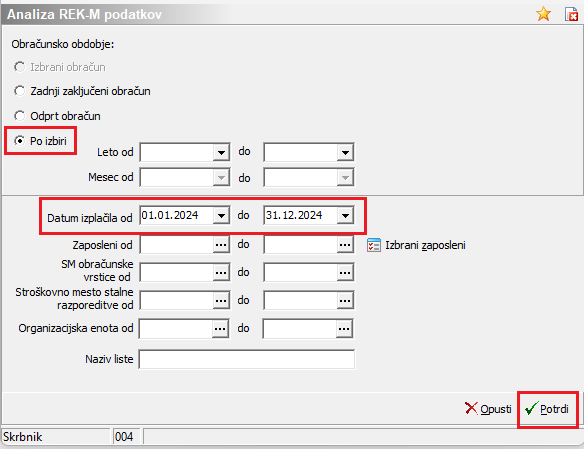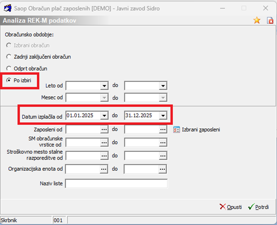 Izberemo obračunsko obdobje Po izbiri in vpišemo Datum izplačila do 1.1.2025 do 31.12.2025 ter kliknemo gumb Potrdi.