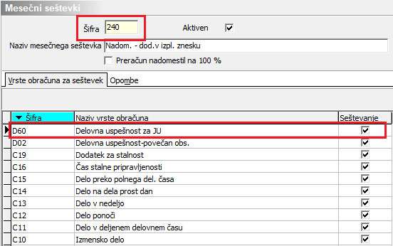 Pomembno si je zapomniti, da se nova vrsta obračuna Delovna uspešnost za javne uslužbence, katero smo vnesli v šifrant obračuna, v našem primeru je to D60 (v vašem primeru je lahko to druga šifra) upošteva v urno postavko za izračun nadomestil (praznik, letni dopust, boleznine v breme delodajalca). Če ste šifro uredili po zgornjem navodilu in ste na koncu potrdili vključitev v mesečne seštevke,