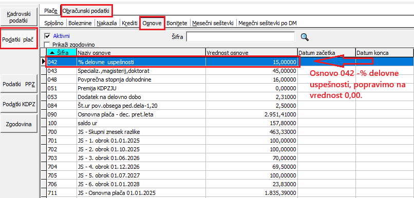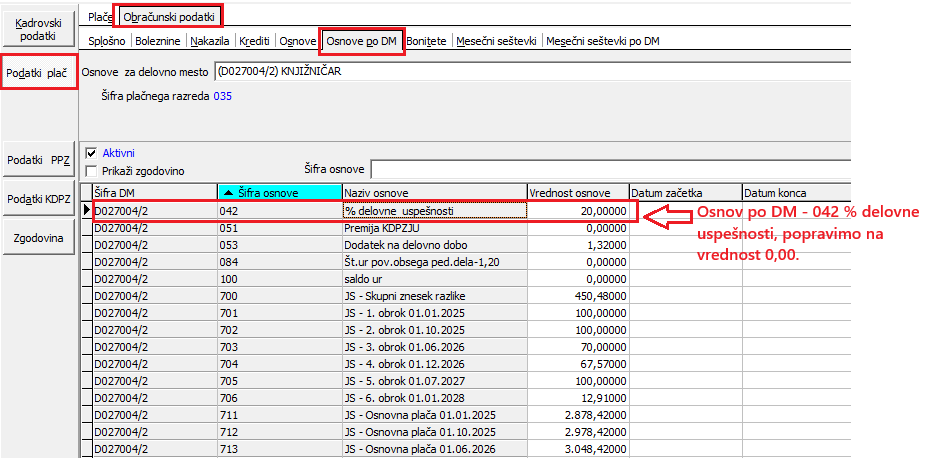 Ker se s 1.1.2026 šifra vrste obračuna D02 Delovna uspešnost-povečan obseg ne uporablja več, ste pa imeli urejeno to vrsto obračuna na %, katere vrednost je vpisana v Osnovi zaposlenega oz. v Osnovi po DM (v primeru delitve po DM zaposlenega), vam svetujemo, da na zaposlenih, kateri so imeli pri plači 12/2025 to obračunano in izplačano, popravite Vrednost osnove na 0,00%. S tem se izognete morebitnemu napačnemu izplačilu pri plači januar 2026, ko velja, da se ta vrsta obračuna ne izplačuje več.