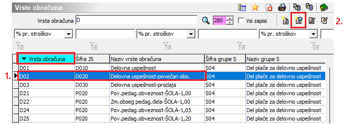 Ker bomo kopirali vse nastavitve iz šifre obračuna D02 – Delovna uspešnost-povečan obseg, se postavimo na omenjeno šifro in jo kopiramo.