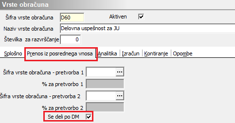 Oznaka - Se deli po DM. Oznaka mora biti aktivna v primeru, da imamo zaposlene na več DM ali da obračun plač knjižimo po Evidentiranju po SM.