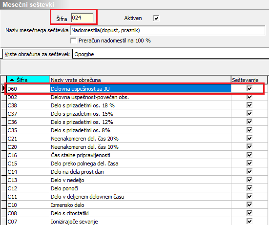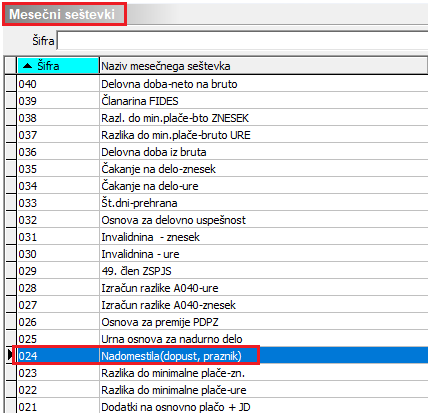 V nobenem primeru, ne smete imeti nove šifre označene v seštevku 024- Nadomestila (dopust,praznik). V tem primeru bo nadomestilo napačno obračunano.