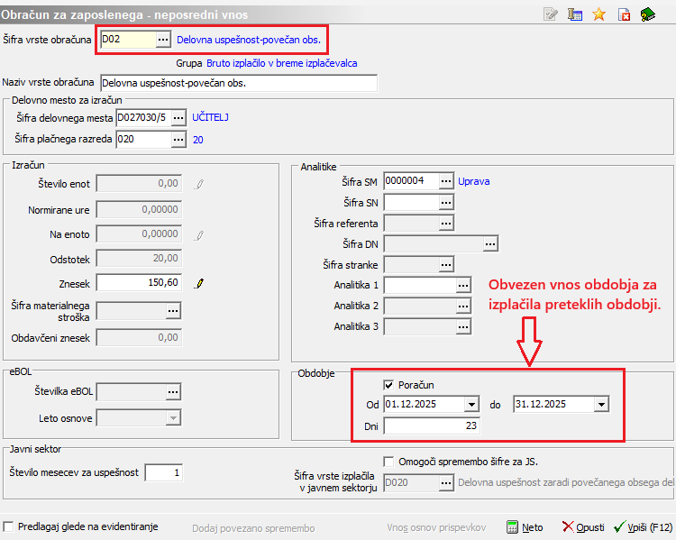 Obstoječe vrste obračuna, ki bi jih potrebovali za izplačilo Delovne uspešnosti-povečan obseg za pretekla obdobja, do vključno 31.12.2025, se lahko še uporabi, vendar je obvezen vnos obdobja na vrstico, kateri ne sme vsebovati obdobja poračuna za leto 2026.