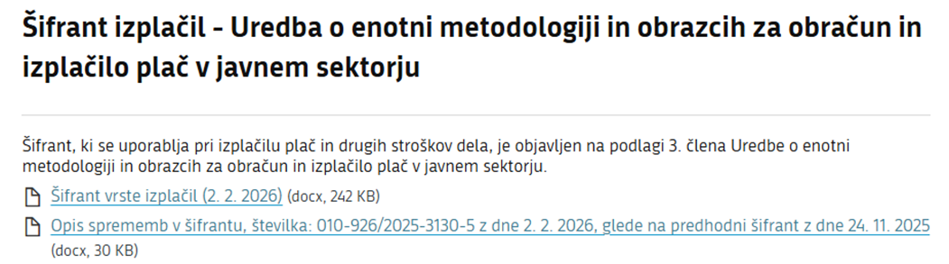 Ministrstvo za javno upravo je dne 02.02.2026 objavilo dopolnitev ŠIFRANTA VRST IZPLAČIL, IZDAN V SKLADU S 3. ČLENOM UREDBE O ENOTNI METODOLOGIJI IN OBRAZCIH ZA OBRAČUN IN IZPLAČILO PLAČ V JAVNEM SEKTORJU (Uradni list RS, št. 109/24 in 6/26) številka: 010-926/2025-3130-5.