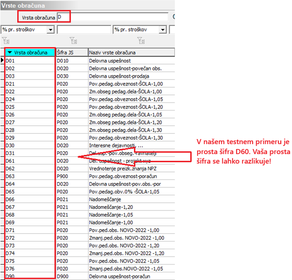 V šifrantu Vrst obračuna najprej preverimo, katera je prva prosta šifra v skupini D od šifre D60 naprej. V našem primeru je prosta šifra D60, v vašem primeru je lahko prosta druga šifra v skupini D.