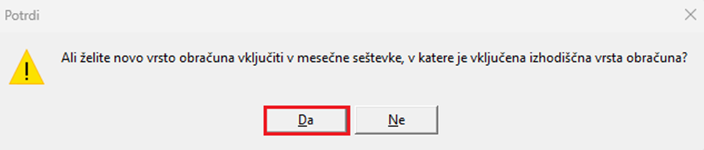 Vključitev nove vrste obračuna v mesečne seštevke OBVEZNO Potrdimo.