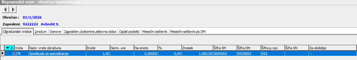 Obračun izvedemo preko gumba Neposredni vnos. Postavimo se na zaposlenega, ki mu želimo izplačati spodbudo za specializacijo.