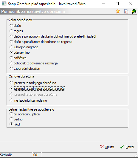 Ko odpremo nov obračun, moramo ob izbiri obračuna označiti, da želimo obračunati Odpravnino oz. Jubilejno nagrado.