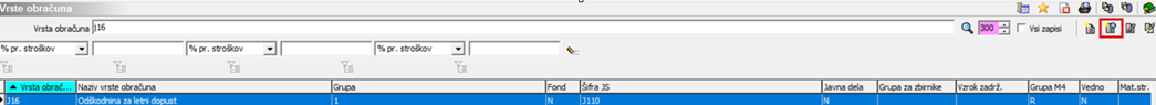 Postavite se na vrsto obračuna J16 – Odškodnina za letni dopust (šifra se lahko razlikuje vaše) in Kliknete na ikono Vnesi zapis iz…