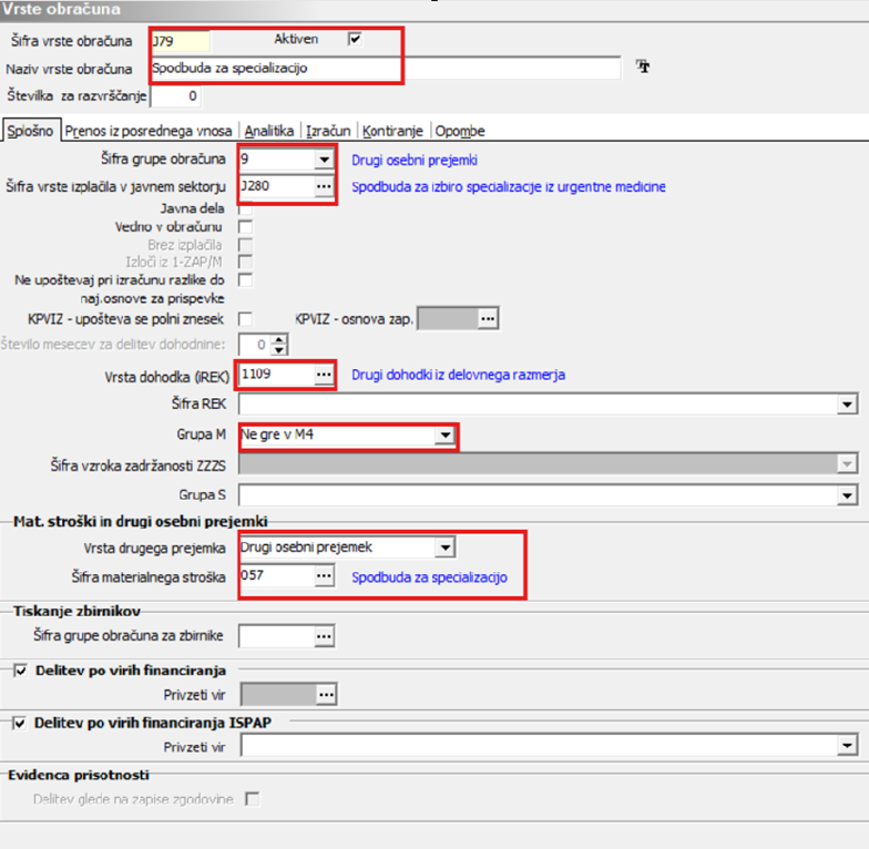 Preden odprete nov obračun priporočamo, da v Šifranti…Sistem obračuna…Vrste obračuna … vnesete novo vrsto obračuna npr. šifro J79 – Spodbuda za izbiro specializacije iz urgentne medicine (prvo prosto šifro od šifre J60 naprej).