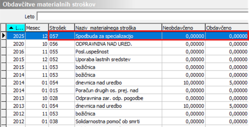 V tabelo je potrebno vnesti zapis z ustrezno šifro materialnega stroška, katerega ste predhodno dodali v šifrant npr. 057 Spodbuda za specializacijo (oziroma drugo šifro materialnega stroška, ki je povezana na vrsto obračuna J79). V polju Neobdavčeno in Obdavčeno morate imeti vneseno vrednost 0,00.   Leto in mesec morata biti vnesena tako, da sta podatka starejša od obdobja, v katerem izvajate obračun. Podatek leto – mesec namreč pomeni, da se od tega leta in meseca naprej na ta način obračuna spodbuda.