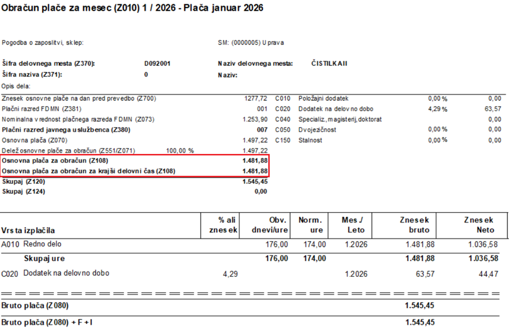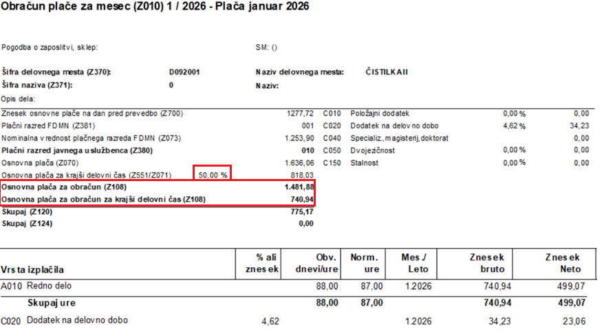 (podatki na sliki so informativni, namenjeni prikazu Z108 za primer zaposlitve za krajši delovni čas)