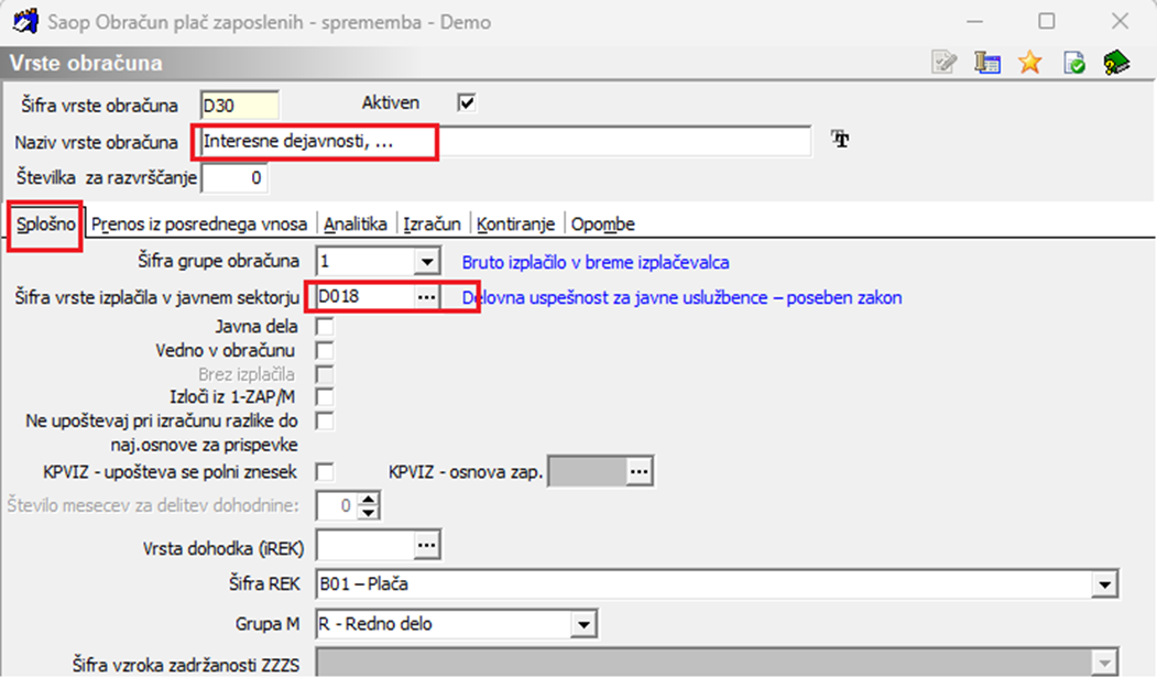 Šifranti…Sistem obračuna…Vrste obračuna … izberete ustrezno vrsto obračuna npr. Interesne dejavnosti,… Na prvem zavihku Splošno si izberete ustrezno novo šifro za JS- D018.