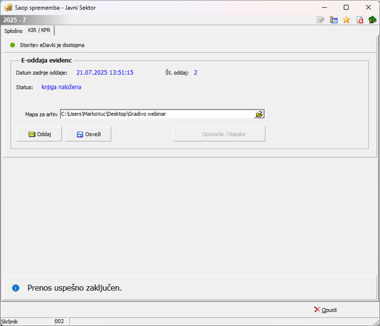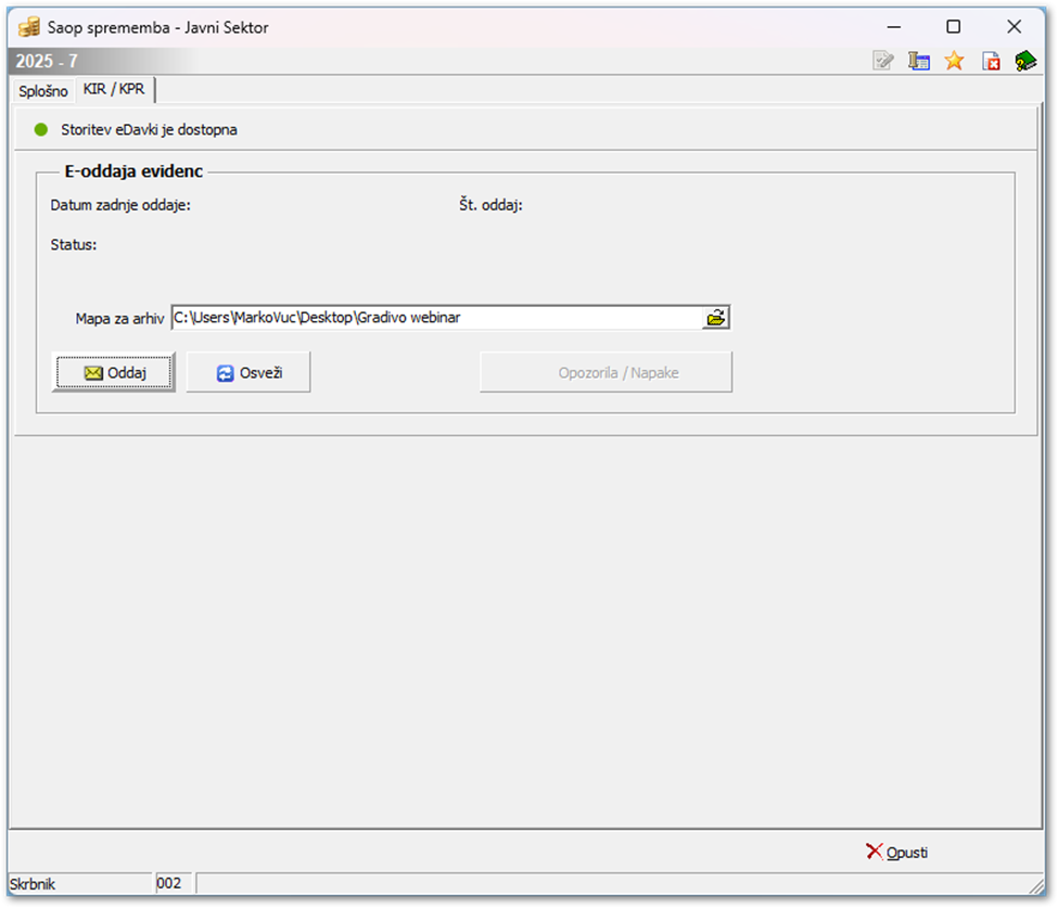 Na oknu je prikazan Datum zadnje oddaje in Št. oddaj in na tak način vemo, kolikrat so bile evidence obračuna že oddane. Po oddaji se zavede tudi Status. V mapo za arhiv lahko navedemo pot, kamor lahko shranimo tudi evidence.