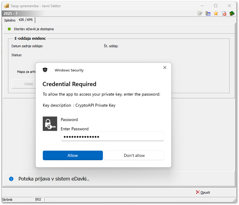 Ob pritisku na gumb Oddaj, se evidence oddajo direktno na portal eDavki. Program od nas zahteva geslo za portal. Vpišemo geslo in pritisnemo Allow.