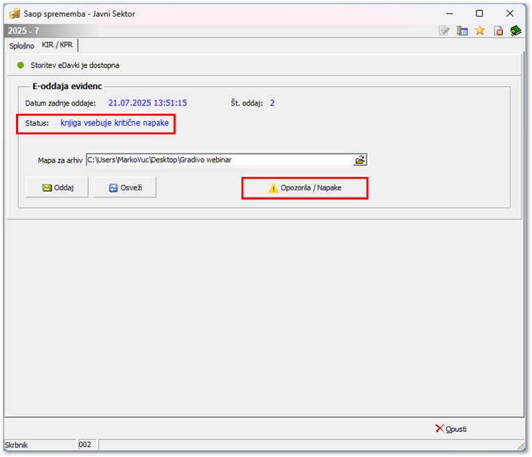 Če se prikaže status »Knjiga vsebuje kritične napake«, mora uporabnik znova poslati nove evidence z odpravljenimi napakami. Napake in opozorila lahko pregledamo preko gumba Opozorila / Napake.