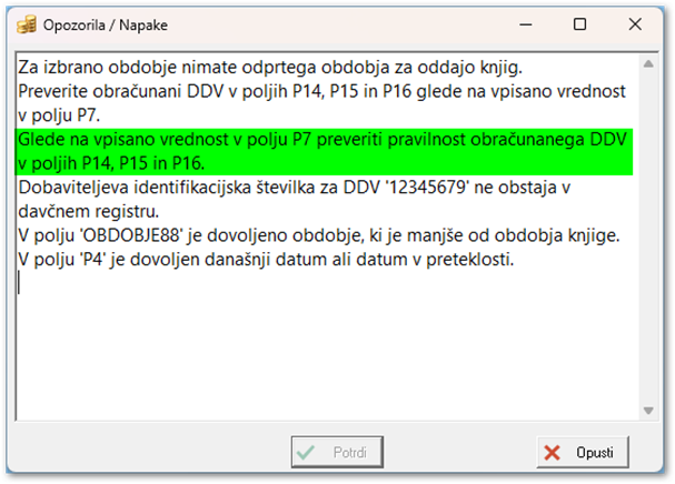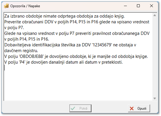 Napake in opozorila, ki se izpišejo na prikazanem oknu so povezana s polji poslanih evidenc. Na gumbu DDVO sta na voljo izpisa poslanih evidenc prejetih in izdanih računov.