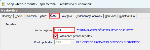 V primeru, da spremenite konto terjatev, ga je treba ustrezno zamenjati tudi v SPR-ju, in sicer v meniju Šifranti → Vrste računov → Konto, da bodo tudi prejeta plačila pravilno knjižena na isti konto.