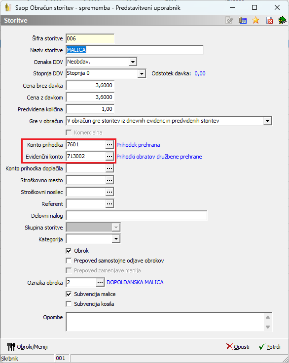 V primeru, da še nimamo urejenih kontov v šifrantu storitev, moramo le-te vnesti za vsako storitev, ki se bo obračunala.