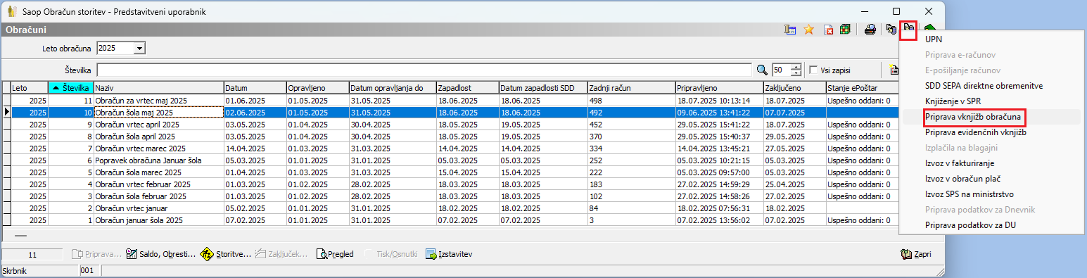 Na obračunu pripravimo knjižbe z gumbom za izvoz podatkov ter izberemo možnost Priprava vknjižb obračuna.