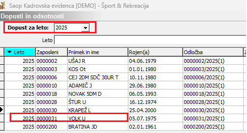 V tabeli Dopust za leto izberete leto 2025 ter izberete še zaposlenega, ki ni izkoristil v celoti dopusta za leto 2024.