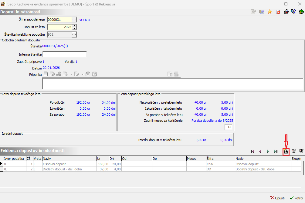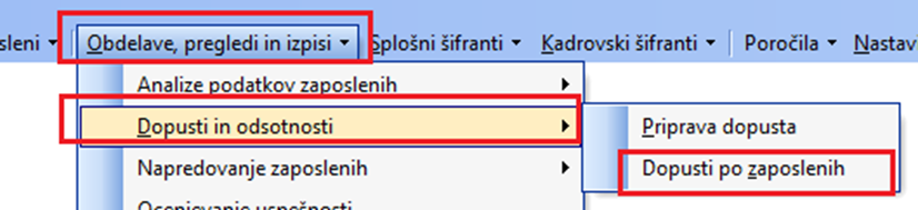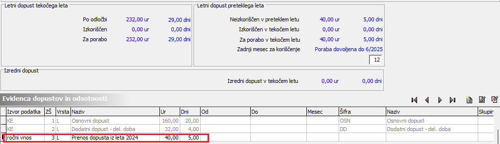Pri tistih zaposlenih, ki do konca leta 2025 še niso izkoristili v celoti dopusta za leto 2024, morate višino tega dopusta ročno dodati pod dopust za leto 2025. To uredite v Obdelave, pregledi in zapisi – Dopusti in odsotnosti – Dopusti po zaposlenih.
