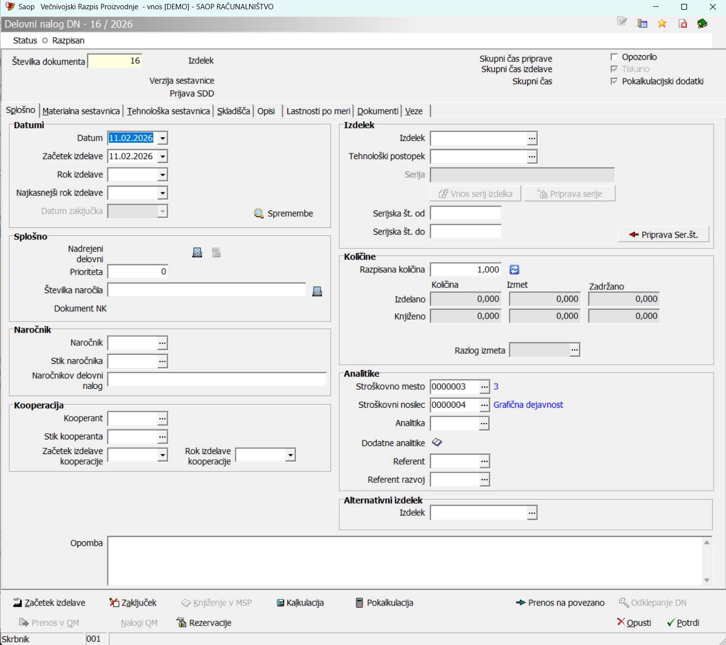 Po vnosu šifre izdelka in količine izdelka v zavihku »Splošno« program avtomatsko formira materialno sestavnico za izbrani izdelek, glede na vnesene podatke v šifrantih.