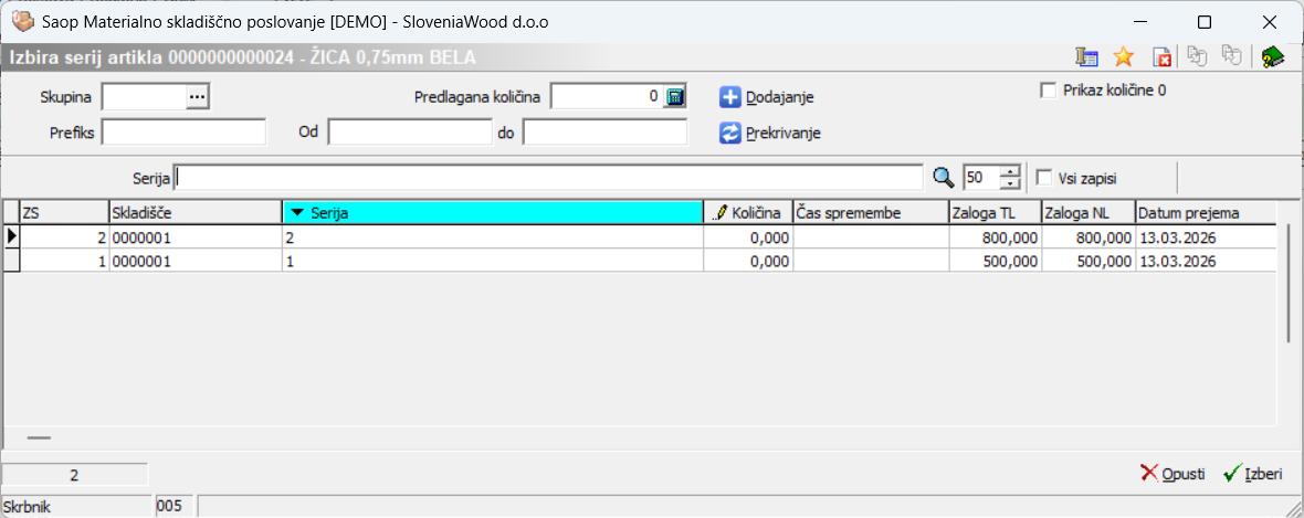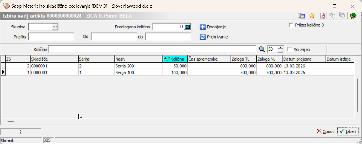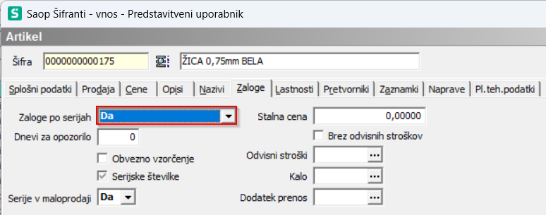 Predpogoj, da to deluje je, da imamo na šifrantu artiklov, katerim se vodijo serije, označeno na zavihku Zaloge, zaloge po serijah Da