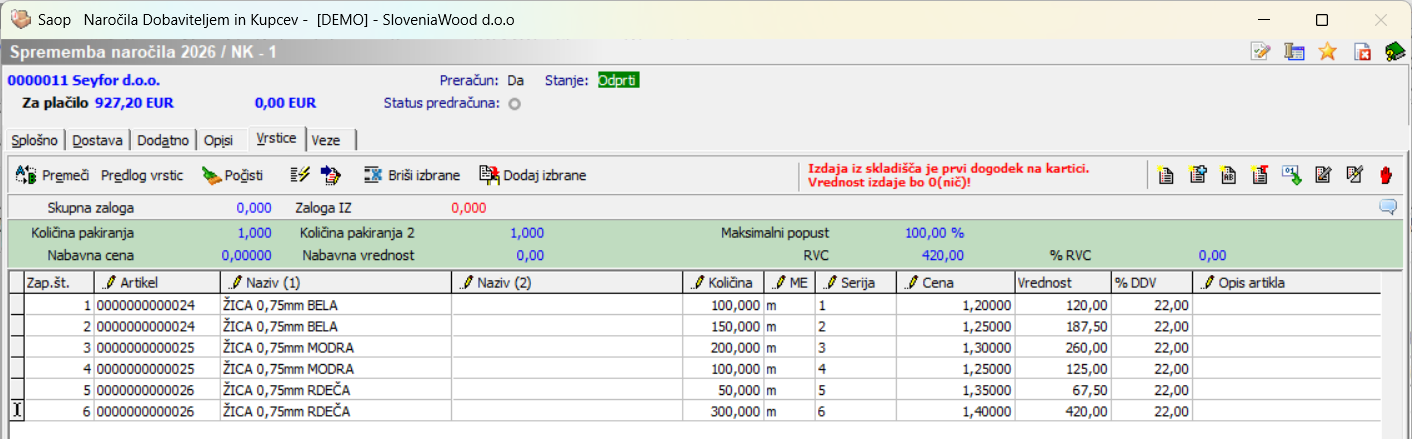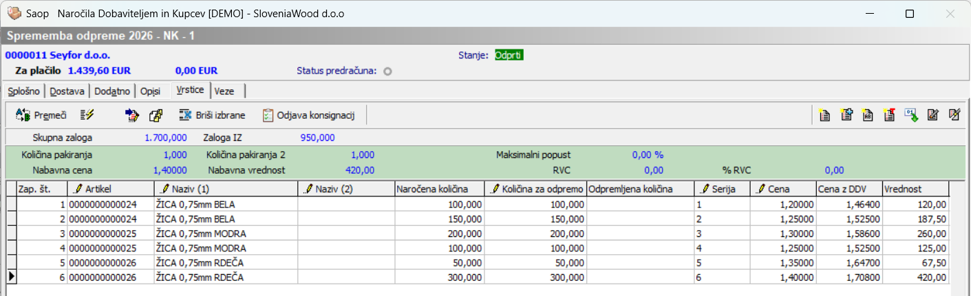 Ko izberemo vse želene artikle s serijami, so nam tako na voljo v preglednici na jezičku Vrstica. Polja, kot so količina, cena, popust, serija, skladišče, vrsta prometa, še vedno lahko popravimo in dopolnimo.Ko se z vnesenimi vrsticami odpreme strinjamo, jih potrdimo in po ustaljenem postopku naredimo odpremo kupca in jo potrdimo, knjižimo v MSP in po potrebi knjižimo v fakturiranje.